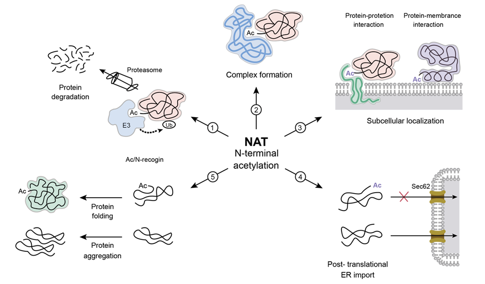 N-乙酰化是真核生物蛋白修饰中最多见的蛋白修饰,85%哺乳动物蛋白,60%酵母蛋白都发现此修饰,但是在原核生物钟很少发现此种修饰。大部分实验表明N-乙酰化通常发生在丝氨酸,丙氨酸和苏氨酸的N端残基上,并且此修饰发生过程中有几种不同的N-乙酰基转移酶参与,随后执行不同分子功能。(如图)