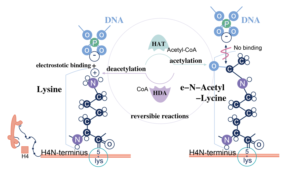 赖氨酸残基发生乙酰化是一个可逆的过程,而且是转录相关过程中染色质蛋白的重要修饰,通过乙酰化修饰影响蛋白之间相互作用和蛋白与DNA的相互作用;在组蛋白乙酰化和去乙酰化过程中,对赖氨酸N末端进行修饰从而影响基因调控;