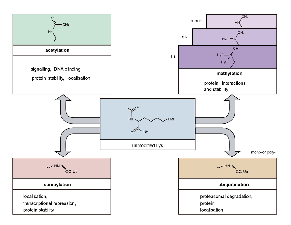 当然赖氨酸残基不仅可以发生乙酰化修饰,还可以发生甲基化、泛素化和SUMO化修饰。因此,赖氨酸残基被不同的酶催化会发生如下的翻译后修饰,如图所示。