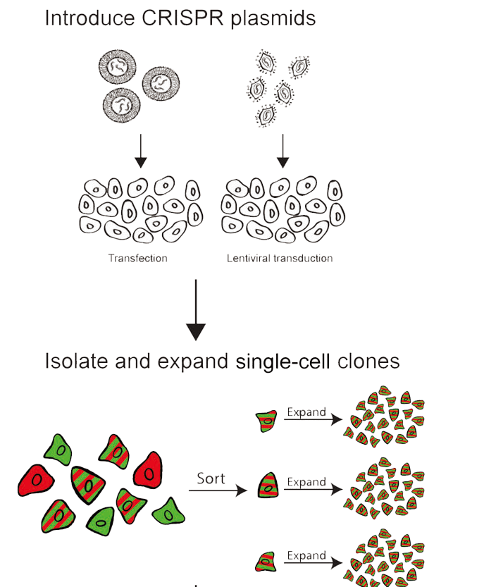 为了敲除目的基因,必须将核酸酶 Cas9 和靶标特异性向导 RNA 递送到细胞中。各种 CRISPR 平台适用于产生敲除,包括“多合一”或单质粒系统(其中 Cas9 和引导 RNA 编码在同一载体上),双质粒系统(其中 Cas9 和引导 RNA 编码在不同的载体上)和直接核糖核蛋白递送。