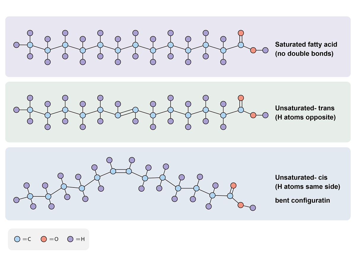 非饱和脂肪酸包括一个或者多个碳碳双键,区分非饱和脂肪酸的方法是通过碳链的长度,碳碳双键的个数以及碳碳双键的位置。大部分自然形成的非饱和长链脂肪酸都是以顺式异构体形(cis isomer)式存在,他比反式异构体(trans isomer)更加稳定。顺式脂肪酸分子间会有一个30度的弯曲,然则反式脂肪酸延展形式类似于饱和脂肪酸链。花生四烯酸有4个顺式双键使脂肪酸链形成U字型,有些顺式脂肪酸具有特定的生物学活性,反式异构体不能替代他们,但是可以像饱和脂肪酸被生物体新陈代谢。