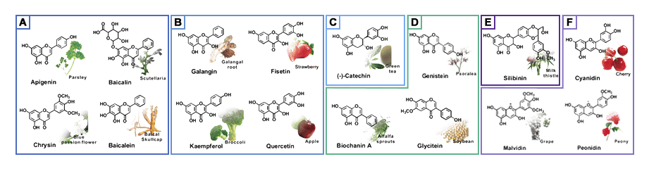 黄酮是一类广泛存在于植物体中,且结构中包含苯并-γ-吡喃酮的多酚类化合物。已经有超过8000多种的黄酮被报道,这些化合物大都以配糖形式存在,例如葡萄苷类。这些化合物大都存在于我们日常饮食中的水果、蔬菜、谷物、瓜果、皮花根茎叶之中,黄酮的摄取不仅局限于上述蔬菜和瓜果,平时喝的饮料例如酒、茶,和咖啡中也普遍存在。