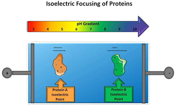 等电聚焦(IEF)是确定蛋白质等电点(pI)最常用、应用最广泛的方法。在 IEF 过程中,给定样品的蛋白质通过 ph 梯度凝胶电泳分解。由于蛋白质在 IEF 中的电泳迁移率取决于它们的净正电荷或负电荷,一旦达到中性 pH 值(蛋白质不再携带净正电荷或负电荷的 pH 值),蛋白质就会保持在相应的 pH值中稳定。这个蛋白质变成中性(或等电)的 pH 值称为蛋白质的 pI。