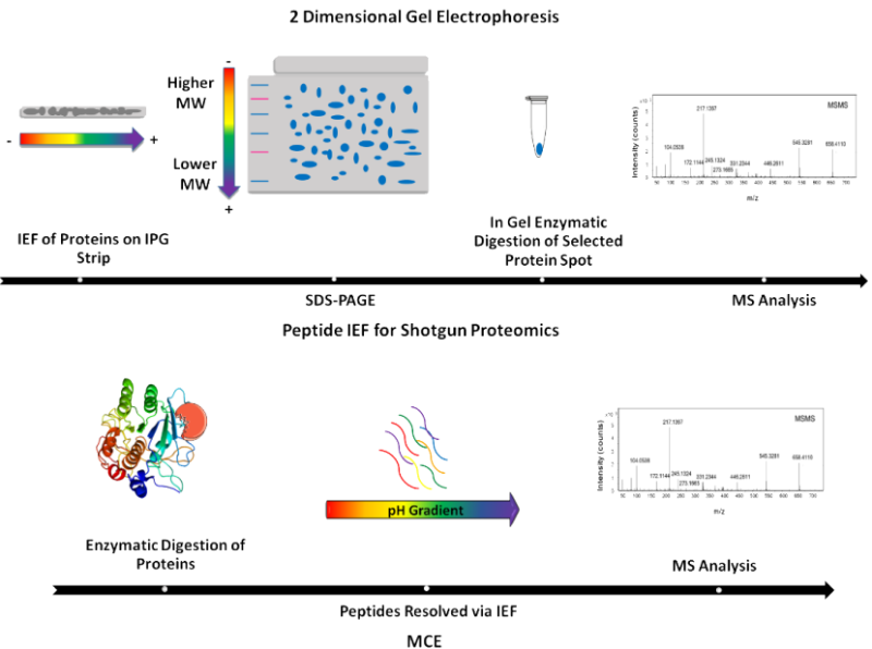 蛋白质在固定 ph 梯度凝胶(IPG)上的电泳迁移率取决于其总正电荷(酸性)或负电荷(碱性),这是 IEF 技术的基本原理。在等电聚焦(IEF)中,带净正电荷或负电荷的蛋白质通过 pH 梯度凝胶迁移,直到到达等电点(pI),即保持中性的 PH 值。因此,蛋白质的pI表示其净电荷,这是决定其在特定环境中稳定性/活性的关键因素。通常,第一维 IPG-IEF 之后是第二维 IPG-IEF,聚焦的蛋白质被变性/还原并在 SDS-PAGE 凝胶上解析,用于随后的免疫印迹来验证蛋白质的身份。最近发展的一维、垂直的 IEF 和免疫印迹技术使多个样本的并发分析(pI 测定)成为可能。