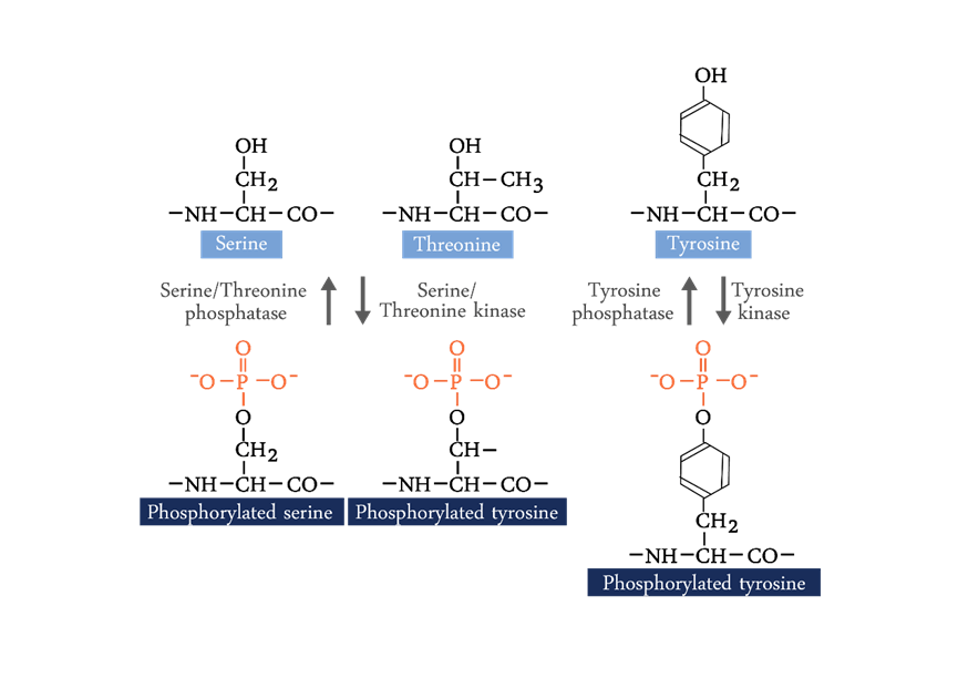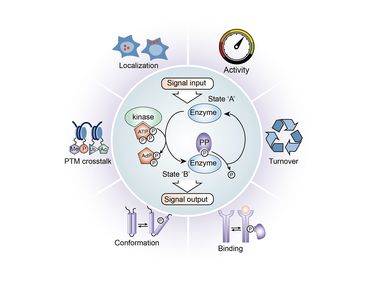 磷酸化修饰通过分子开关的机制,影响并参与了几乎整个细胞生命活动过程,包括蛋白酶活性调节,蛋白转换,蛋白相互作用,亚细胞定位,蛋白构象改变,蛋白稳定性以及连接其他蛋白分子的能力。