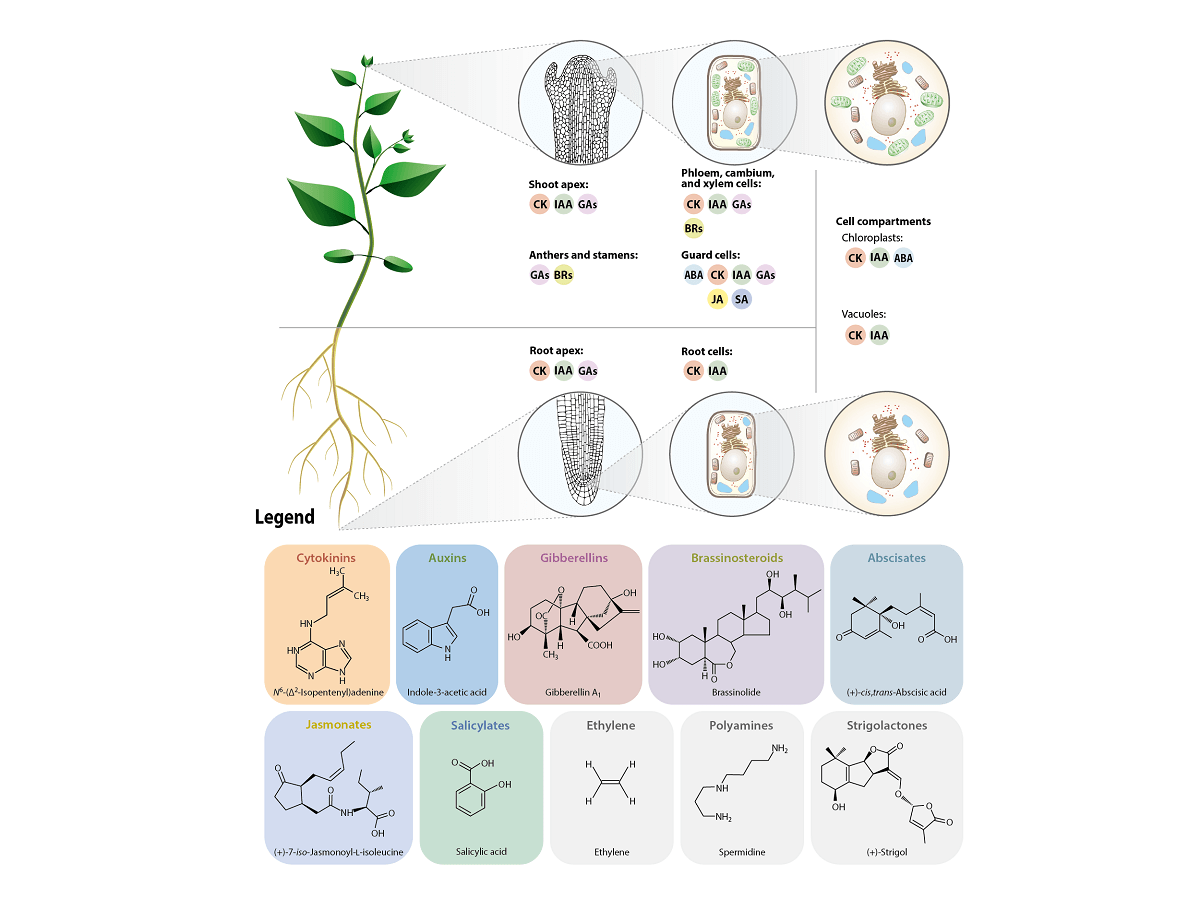 植物的生长和发育通常是由几种不同的植物激素协同完成,五种经典的激素分类包括植物生长激素,细胞分裂素,赤霉素,脱落酸和乙烯。另外,其他新的激素种类也在慢慢被科学家们发现,比如油菜素内脂,茉莉酸,水杨酸和多胺。这些激素在植物生长发育过程中起着至关重要的作用,并且这些激素的受体及其相关信号通路已经被诸多科学家研究发现。