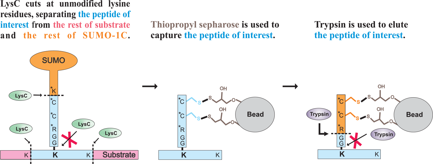 通过使用两种不同的蛋白酶,LysC酶可以使蛋白消化后以富含半胱氨酸为支链,可以通过与巯基特异性树脂(Thiopropyl-Sepharose 6B)的共价结合而被特异性保留。而通过胰蛋白酶则总固定半胱氨酸标签中释放出目标肽段。结果在赖氨酸残基上获得了含有两个额外质量的甘氨酸残基的肽段,从而可以用质谱方法鉴定SUMO化修饰位点。