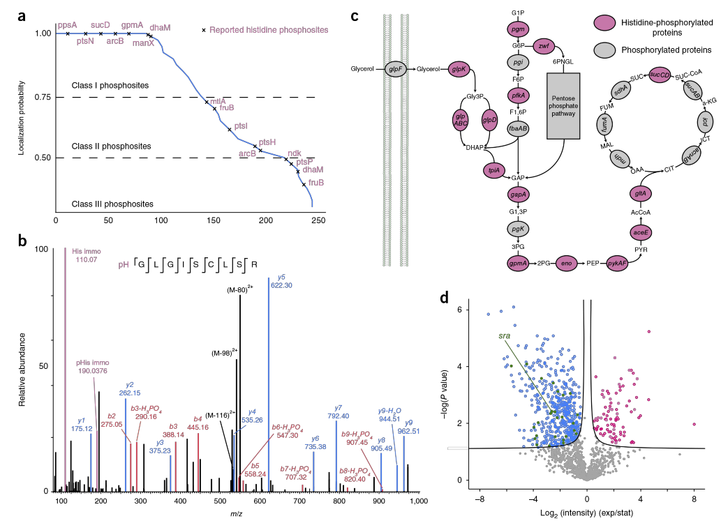 有几个关键问题限制了对组蛋白磷酸化修饰进行大规模分析,首先是因组蛋白磷酸化的化学键没有O-磷酸化的化学键稳定,并且在酸性环境下组氨酸的磷酸化集团也会发生水解,因此常用IMAC富集方法并不适合;此处并没有用运用常规的磷酸化富集方法处理,而是采用了Fe3+IMCA柱子进行磷酸化肽段,如图1a所示。