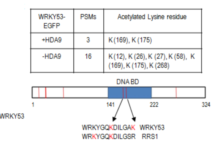 研究HDA9WRK53通过赖氨酸脱乙酰化作用的转录功能调控,我们从野生型植物免疫沉淀反应纯化WRKY53-GFP蛋白,hda9-1,HDA9-OE背景使用anti-GFP抗体和分析WRKY53-GFP赖氨酸乙酰化水平使用anti-acetylated赖氨酸抗体。与野生型相比较,hda9-1和HDA9-OE中WRYK53-GFP赖氨酸乙酰化水平分别升高和降低。为了进一步研究HDA9调控的赖氨酸乙酰化位点我们对免疫沉淀的WRYK53-GFP蛋白与HDA9-gst孵育或不孵育后进行了质谱(MS)分析。在没有HDA9-GST的情况下检测到7个乙酰化赖氨酸残基(K12、K26、K27、K58、K169、K175和K268),在有HDA9-GST的情况下检测到2个赖氨酸残基(K169和K175)。结果表明,WRYK53经过翻译后赖氨酸乙酰化修饰,大部分可以被HDA9去除。hda9靶向乙酰化位点位于WRKY53 DNA结合区域外。