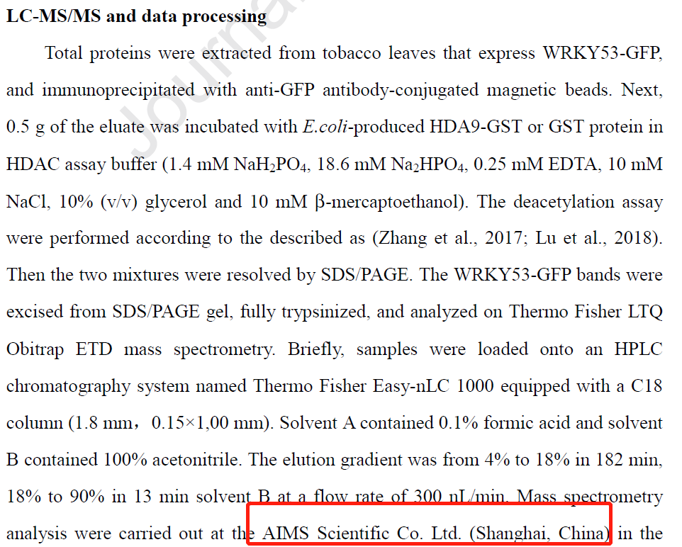 所有蛋白从烟草叶片中提取,并通过GFP磁珠抗体进行免疫共沉降实验,质谱实验室在Aimsmass公司进行检测分析,本公司可提供专业的乙酰化位点鉴定,以及相关蛋白修饰位点鉴定服务。