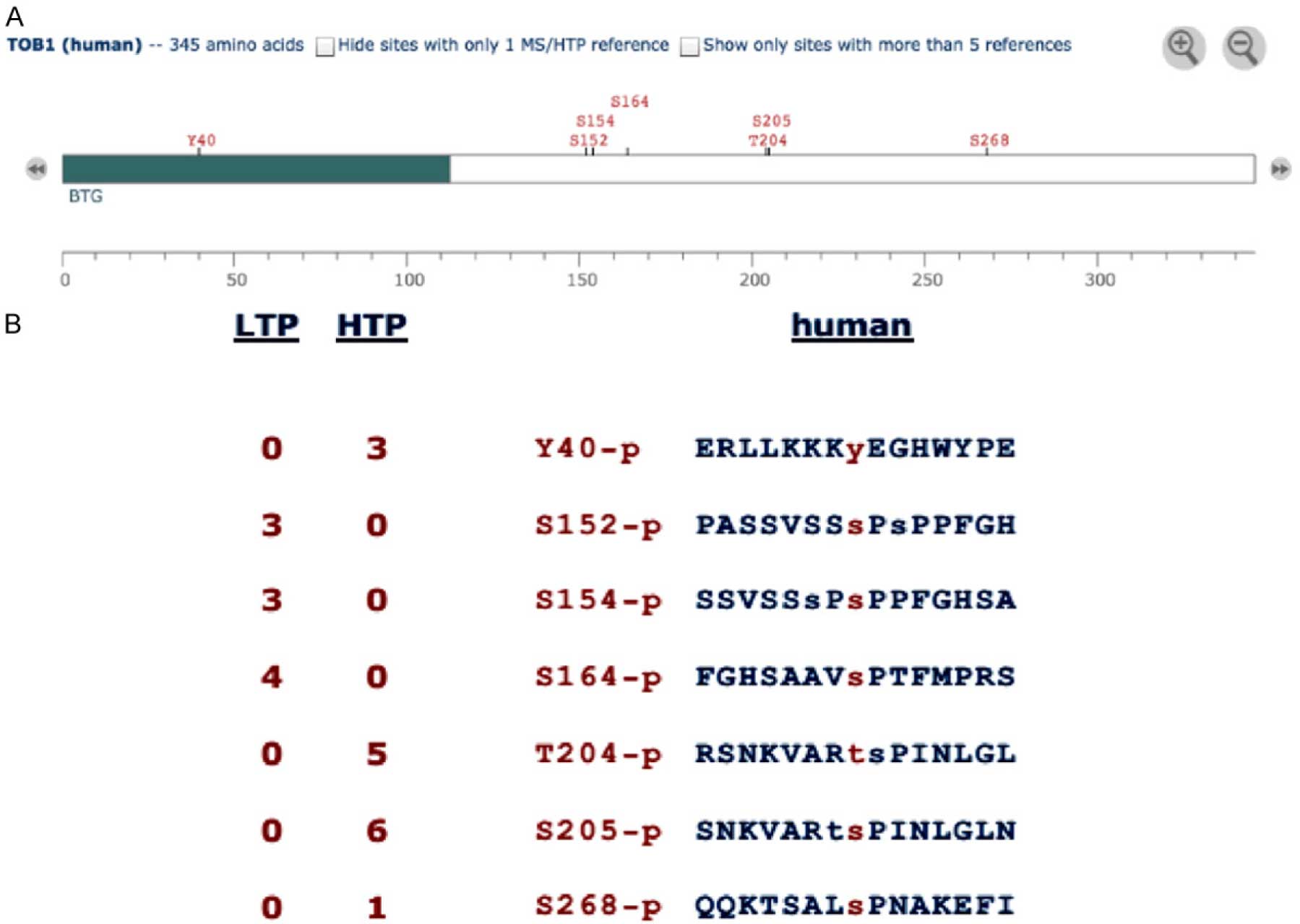 PhosphoSite-Plus软件被用来寻找phosTOB1的构造状态(图1),在已知的磷酸化网站主要是来自报告数据分析的低通量(LTP)和高通量(HTP)的检测,如磷酸化TOB1可能出现在多个位点,我们随后研究了磷酸化位点的TOB1胃粘膜上皮细胞系GES-1和胃癌细胞株HGC-27 AGS和MKN-1。