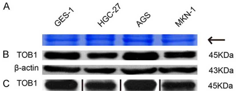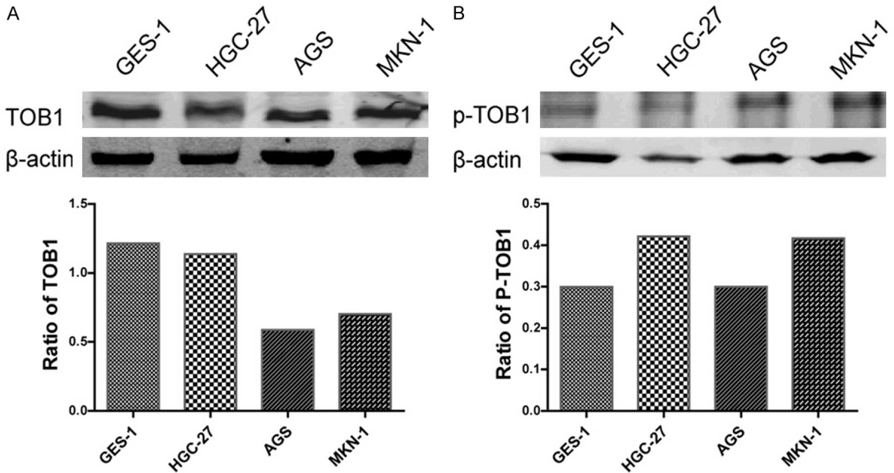 用WB检测了TOB1和p-TOB1的蛋白水平,结果显示,在三种恶性细胞系中,p-TOB1的水平(图2)高于胃黏膜细胞,尽管在胃癌细胞中,TOB1总蛋白水平较低(图2)。