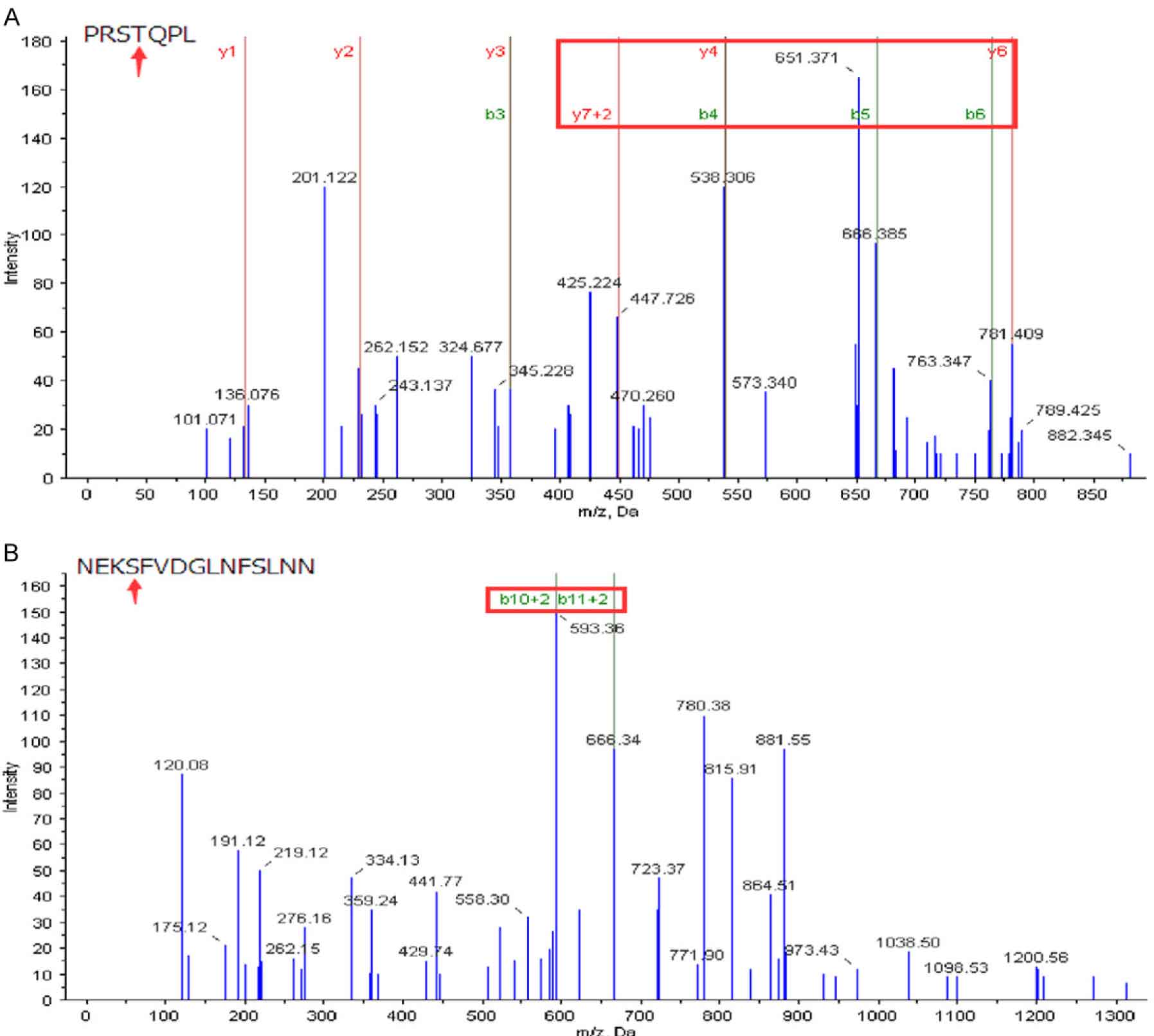 为了确定表达pTOB1的细胞系中的磷酸化位点,我们先通过IP富集TOB1蛋白(图3),利用IP特异性抗体,通过WB在四种细胞系中鉴定了TOB1蛋白表达(图3),并在IP结果中发现了TOB1蛋白表达(图3)。对IP后洗脱液中的蛋白质进行烷基化、酶解、脱盐、沥干、溶解,并用LC-MS/MS分析。随机的蛋白质降解成多肽分子量不同进行磷酸化肽段分析(图4)。结果在分析目标蛋白的氨基酸苏氨酸172和320 (T172,图4)和丝氨酸(S320,图4 )有磷酸化修饰位点。