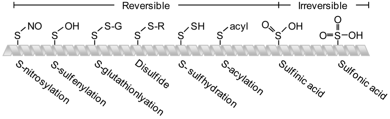 活性氧与氮可与Cys反应,形成几种可逆(S-亚硝基化、S-谷胱甘肽化、磺酸化、分子间和分子内二硫键和S-巯基化)或不可逆(亚砜或亚磺酸)修饰之一。 氧化半胱氨酸修饰的修改,列出了几种常见的生理可逆和不可逆氧化还原修饰,通常发生在半胱氨酸的硫醇侧链上。亚磺酸修饰处于可逆和不可逆的中间状态,在一些特殊的情况下,发现它是可以被酶逆转的。