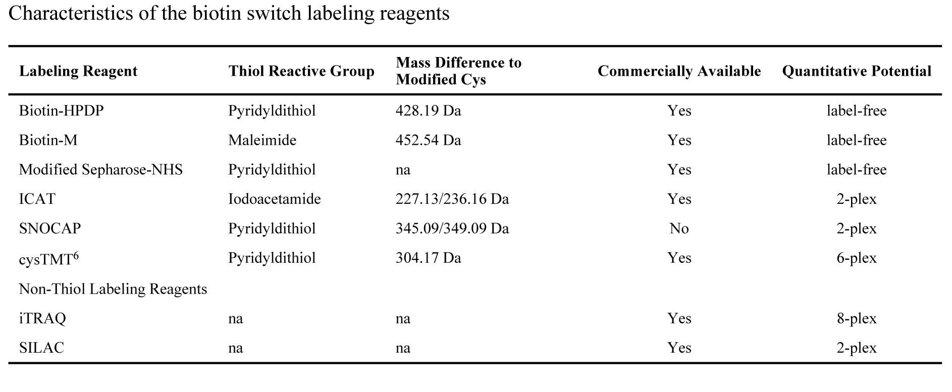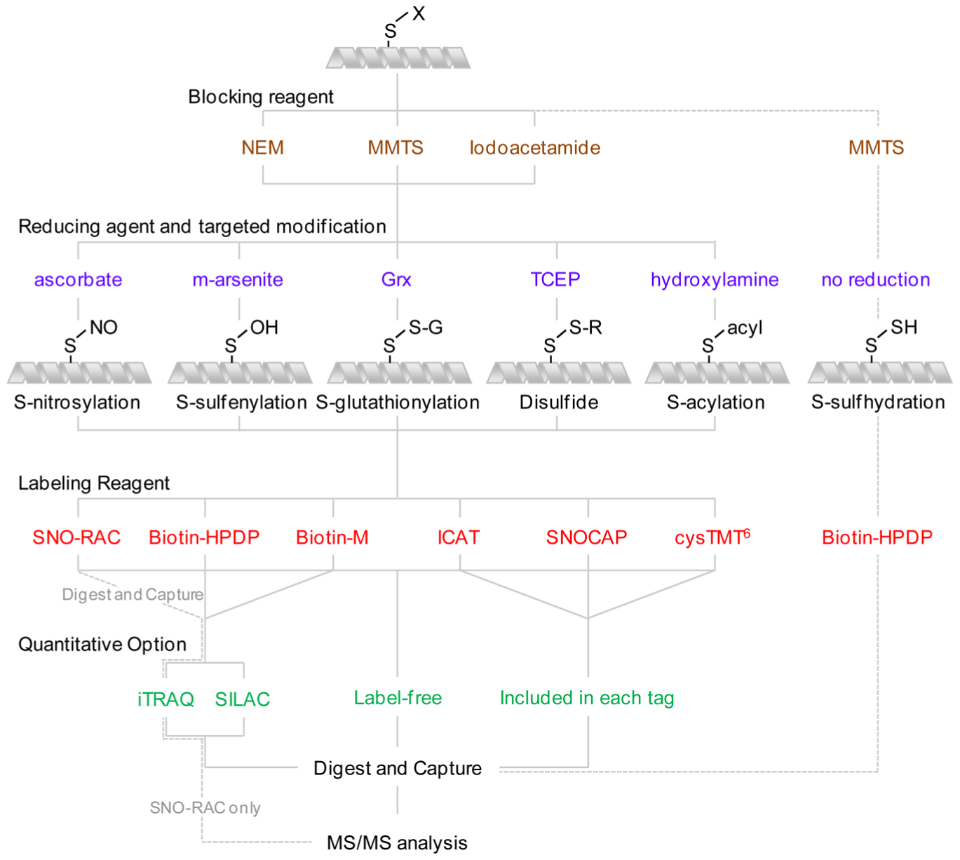 由于SNO修饰非常不稳定,因此使用传统的生化方法检测具有较大的挑战性。在游离硫醇被封闭(NEM,MMTS或者碘乙酰胺)的情况下使用一种替换策略,SNO修饰则被抗坏血酸进行还原那么新暴露的硫醇同时被标记上活性生物素标签。一旦被修饰的位点被稳定的生物素集团标记,链霉素亲和层析方法可以很容易的检测和富集这些肽段。这种方法已经扩展到可以简单单个Cys的位点鉴定,通过引入酶切消化的方法。这导致了只有生物素化的肽段可以通过质谱来检测修饰蛋白以及单个蛋白的Cys修饰位点。