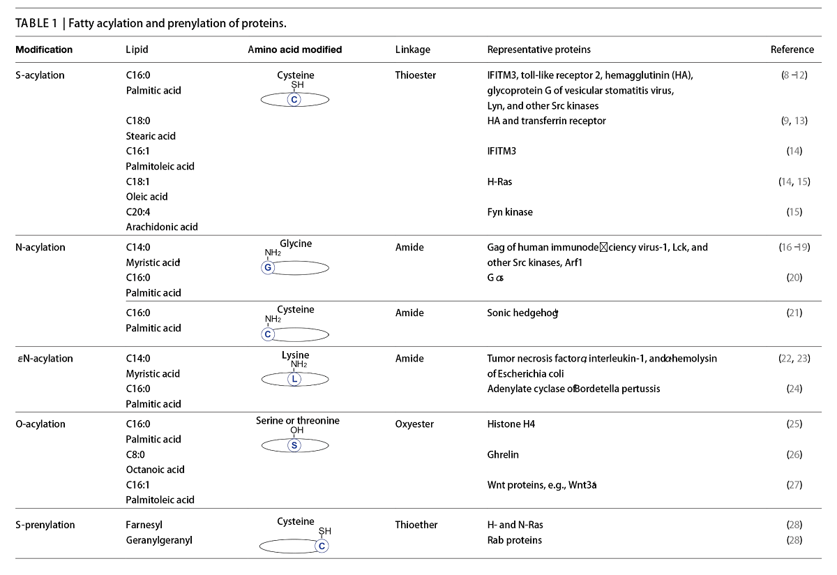 此表1中棕榈酸通过与氨基酸残基共价形成氧化物,酰胺和硫酯等,形成一系列O-和N-棕榈酰化蛋白修饰,以及类似的其他蛋白脂质化修饰,包括N-豆蔻酰化和S-异戊二烯化。